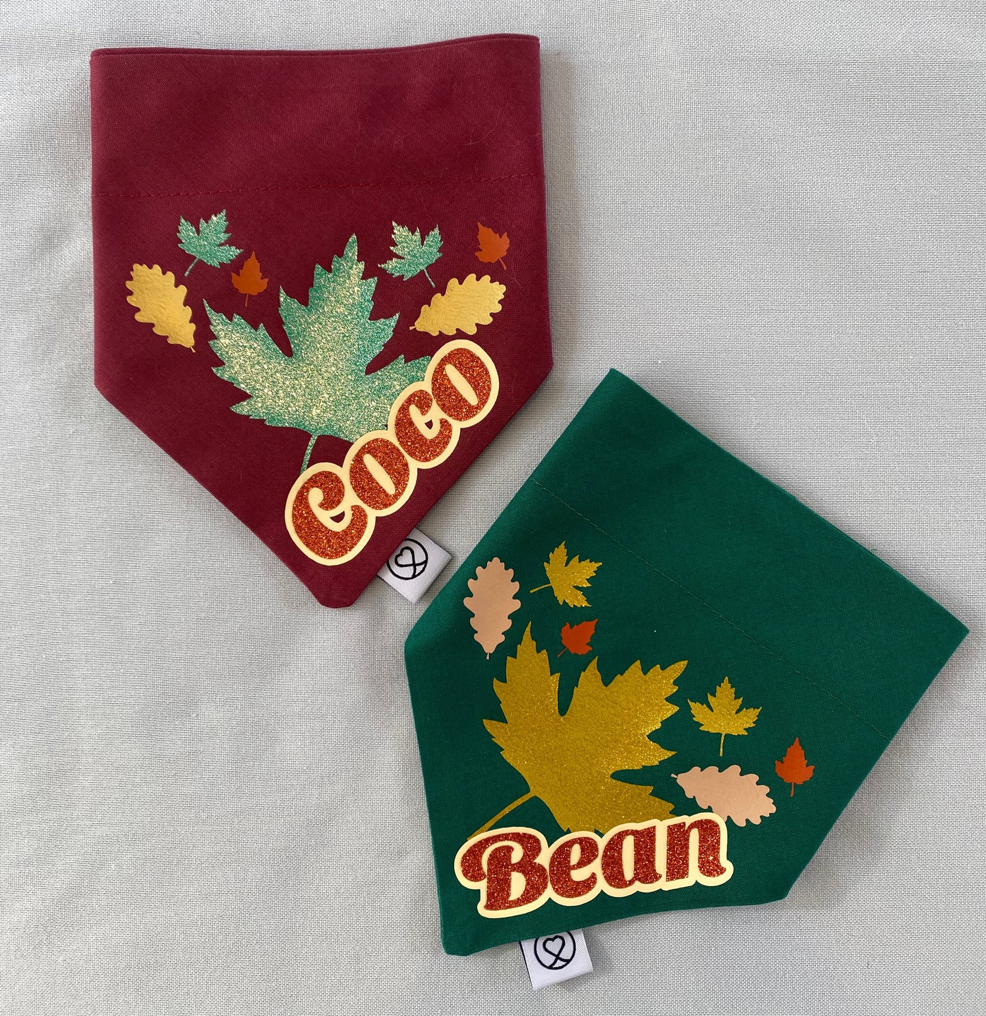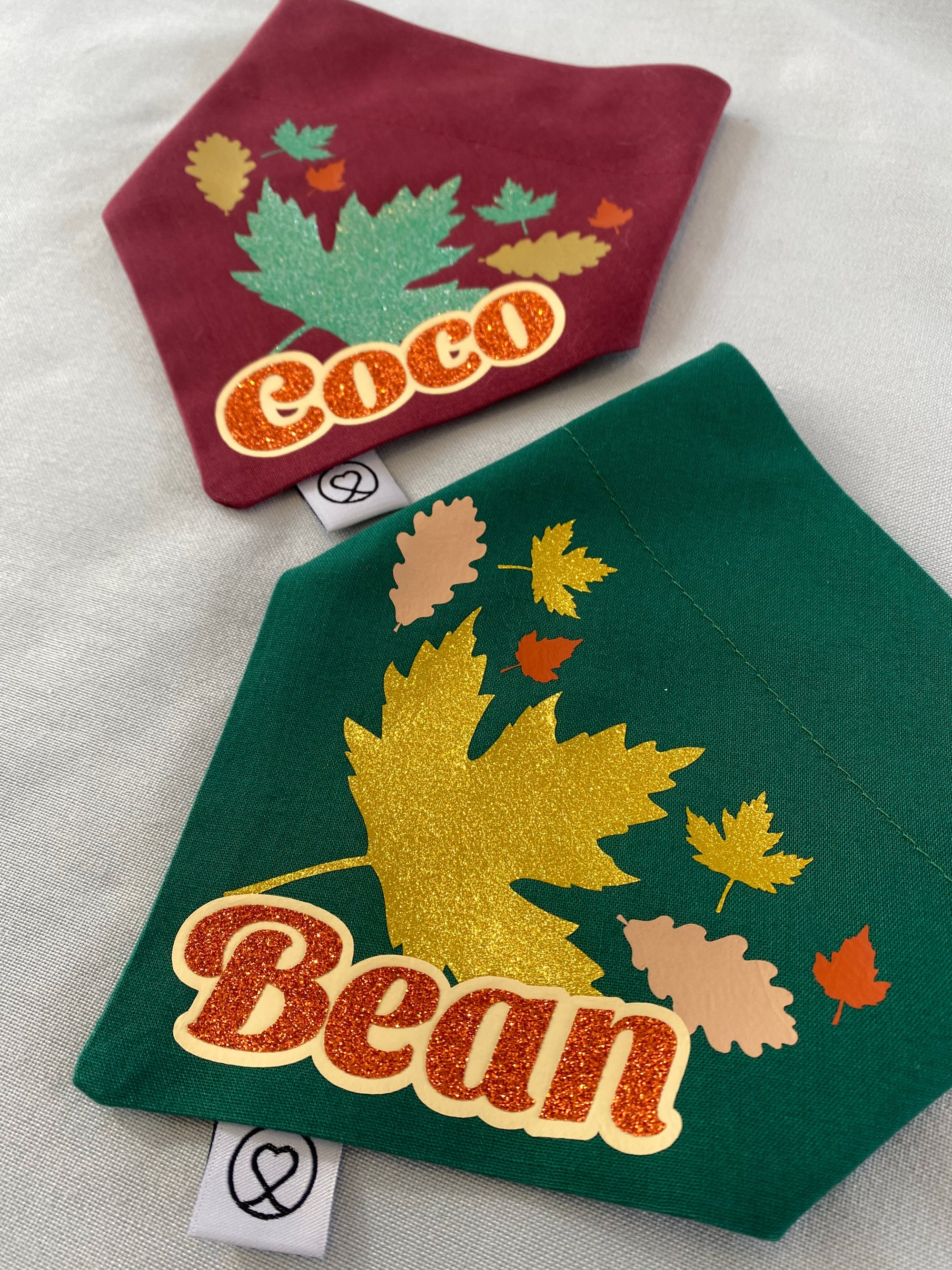 Handmade 100% cotton Autumn leaves personalised dog bandana with hand printed vinyl print. Choose between dark green or maroon.