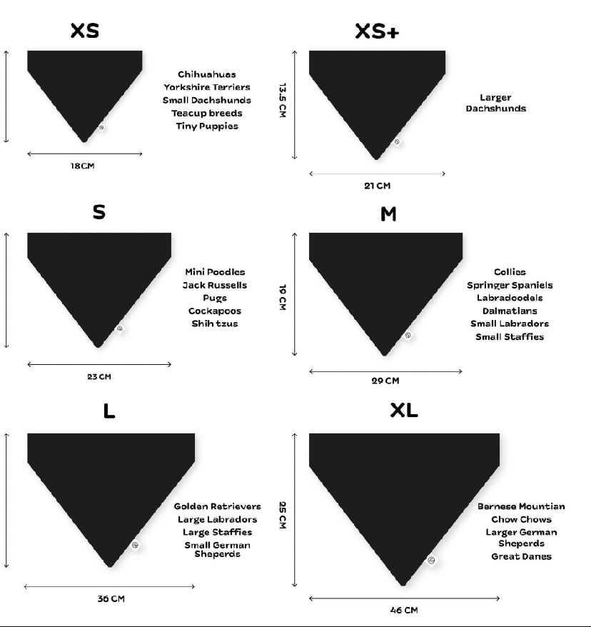 See the size guide in our listing pictures for measurements. Please note that these are the sizes of the ‘slip on collar’ bandanas. The ‘tie on’ bandanas have additional ties attached which you tie around your dog’s neck. The size of the actual bandana is the same.