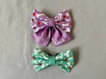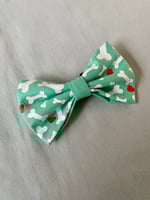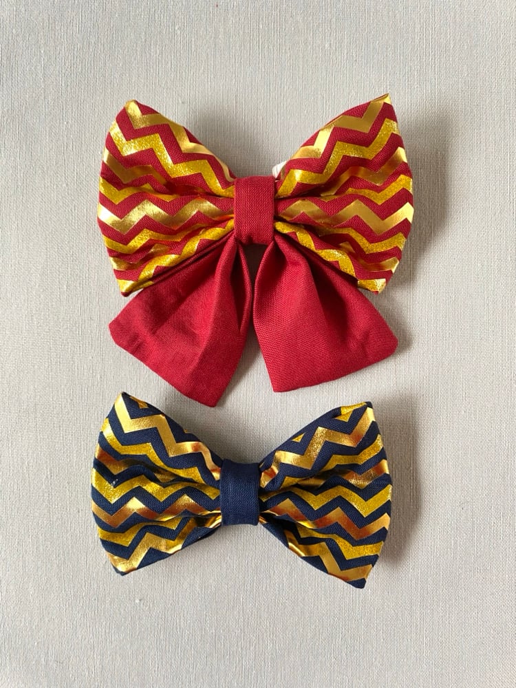 Our bows are handmade with premium printed cotton fabric and are backed with interfacing to help bows keep their shape longer. Bows include an elastic band on the back to slip easily onto collars. Elastic bands can stretch and fit on most collars up to 1.5" wide. Please message me if you need a bow that fits a collar wider than 1.5".