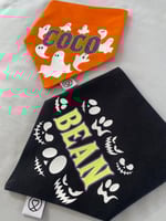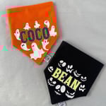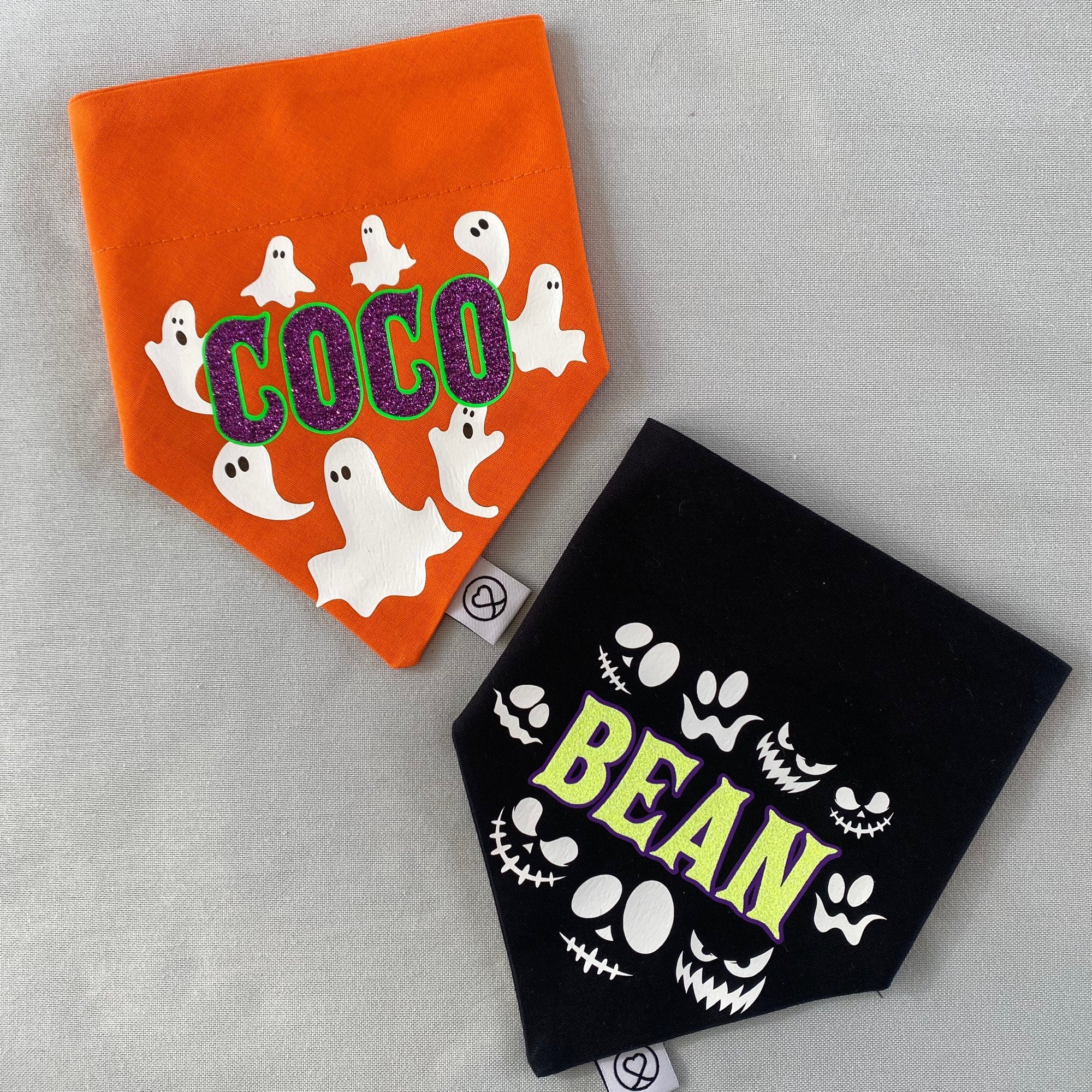 Handmade 100% cotton Halloween personalised dog bandana with hand printed vinyl print. Choose between glow-in-the-dark ghosts or spooky faces on a choice of orange or black.