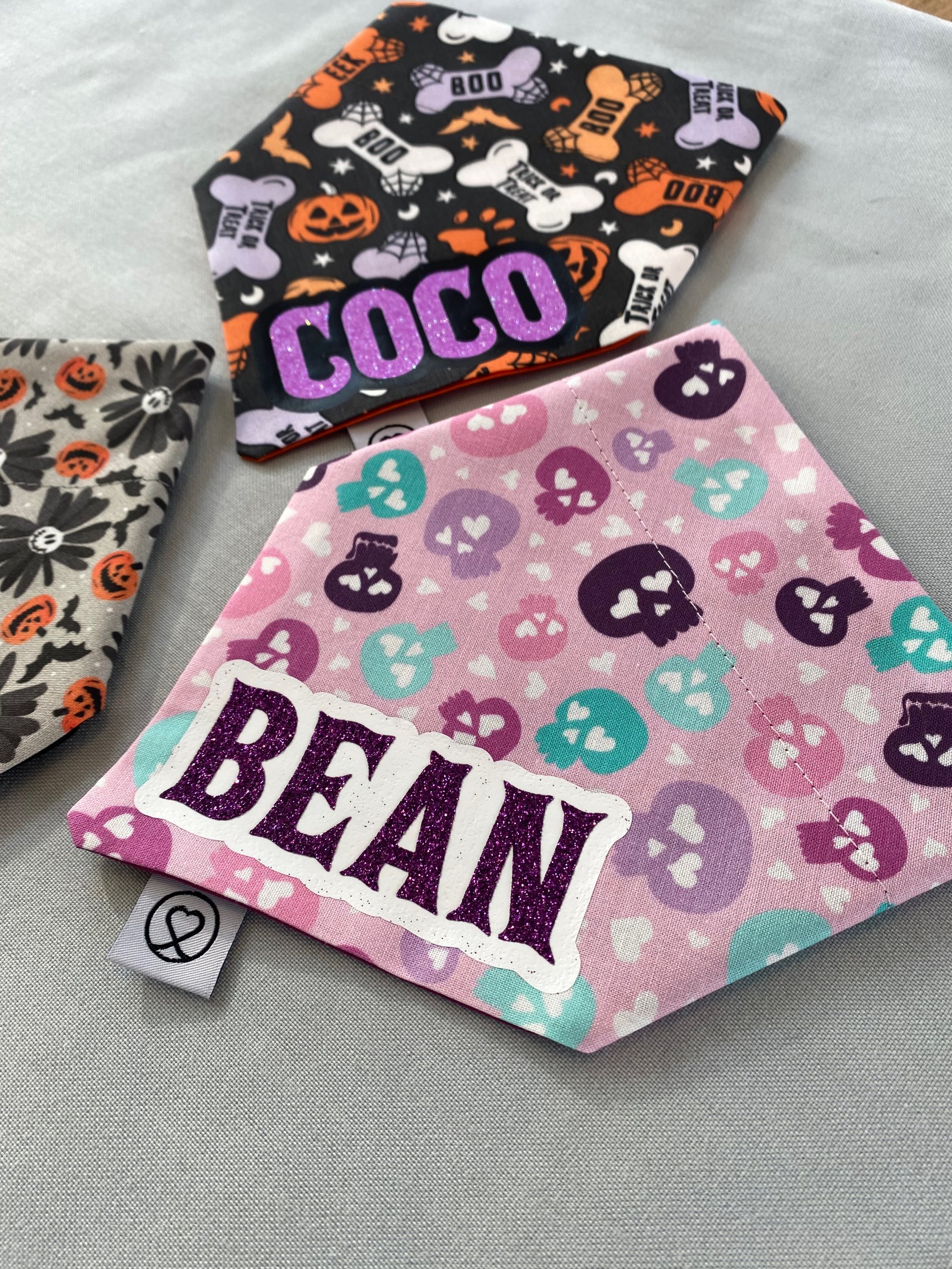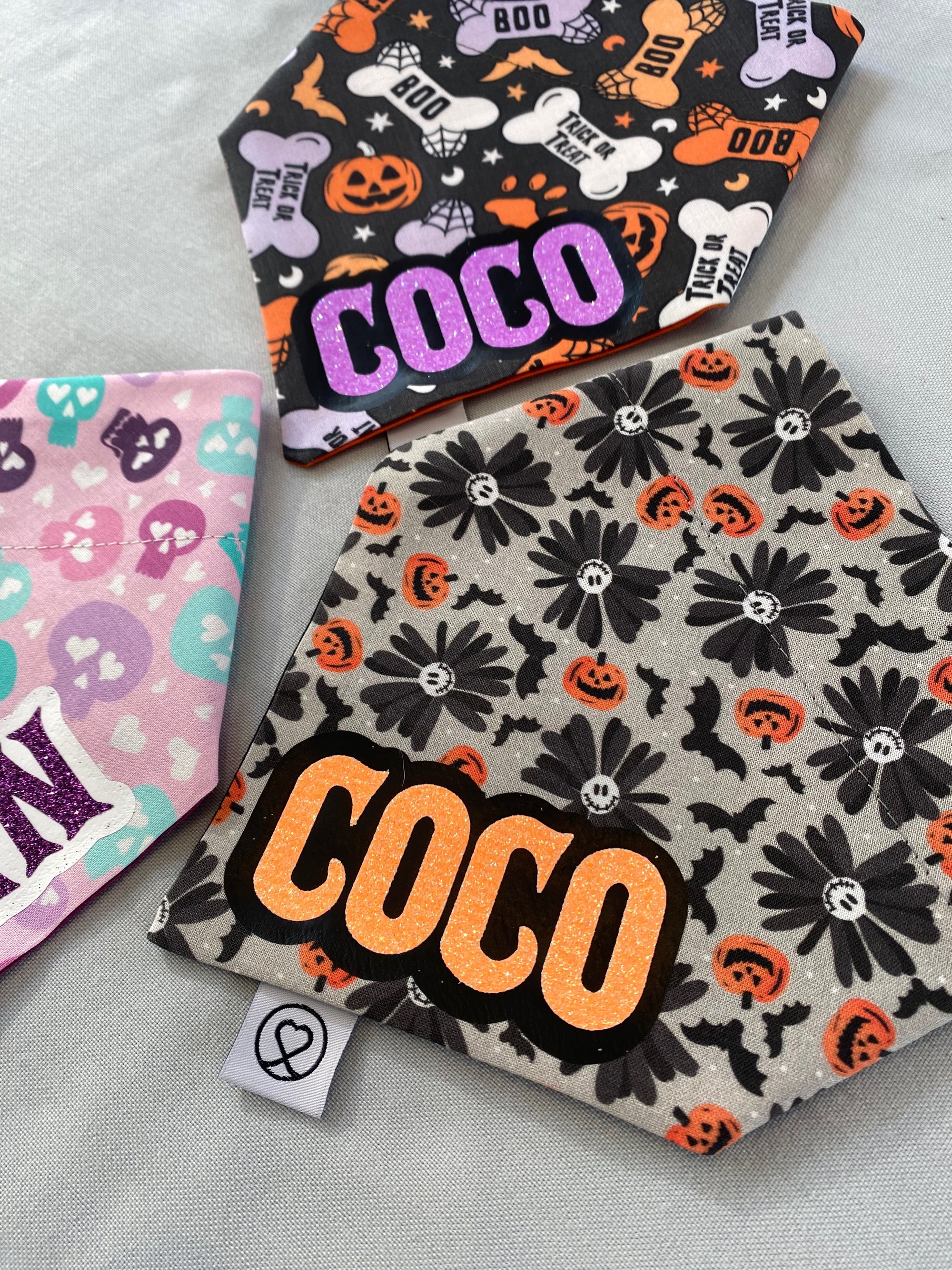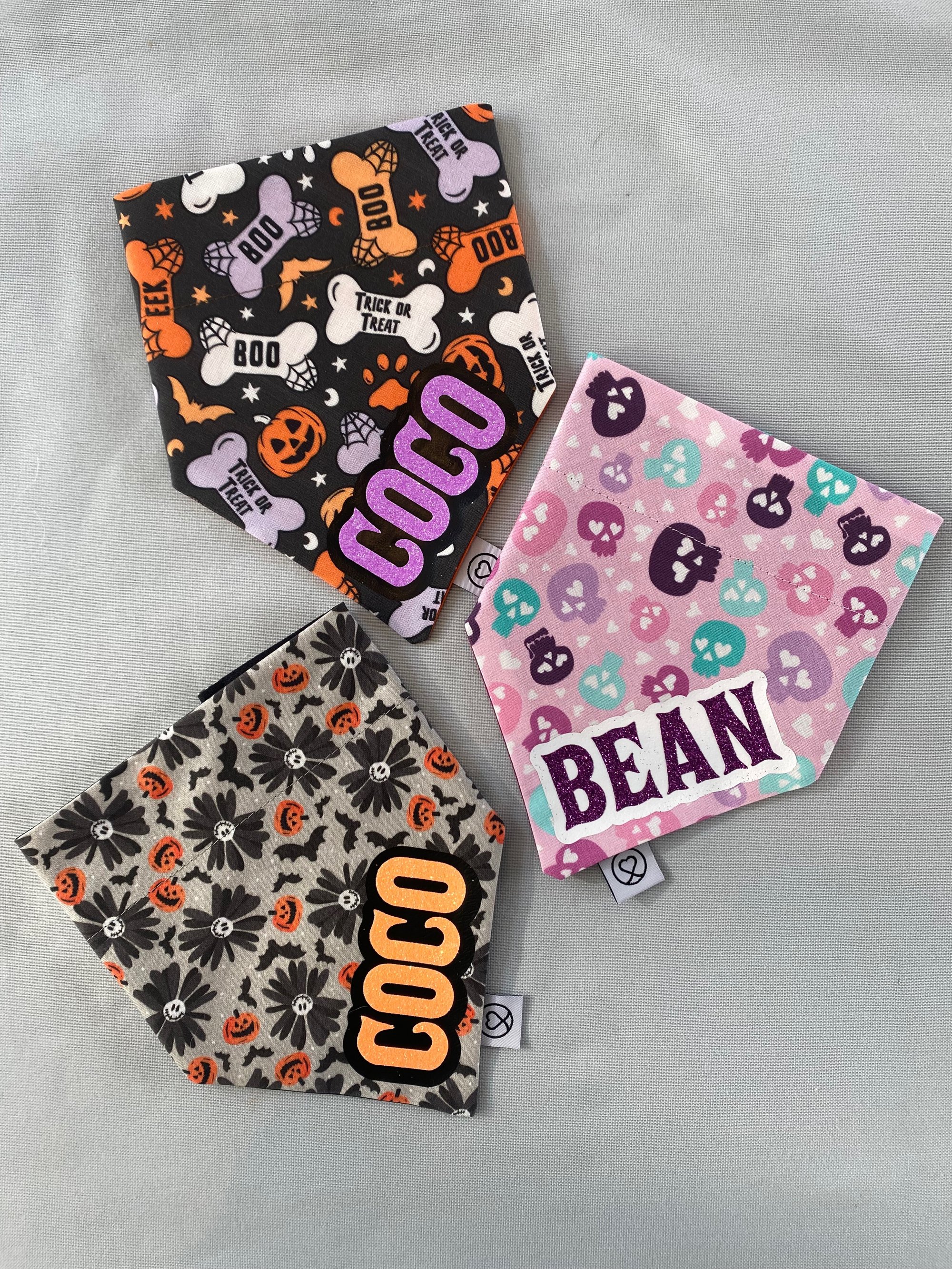 Halloween Personalised Dog Bandanas, Spooky Daisies, Trick or Treat, Skulls and Hearts