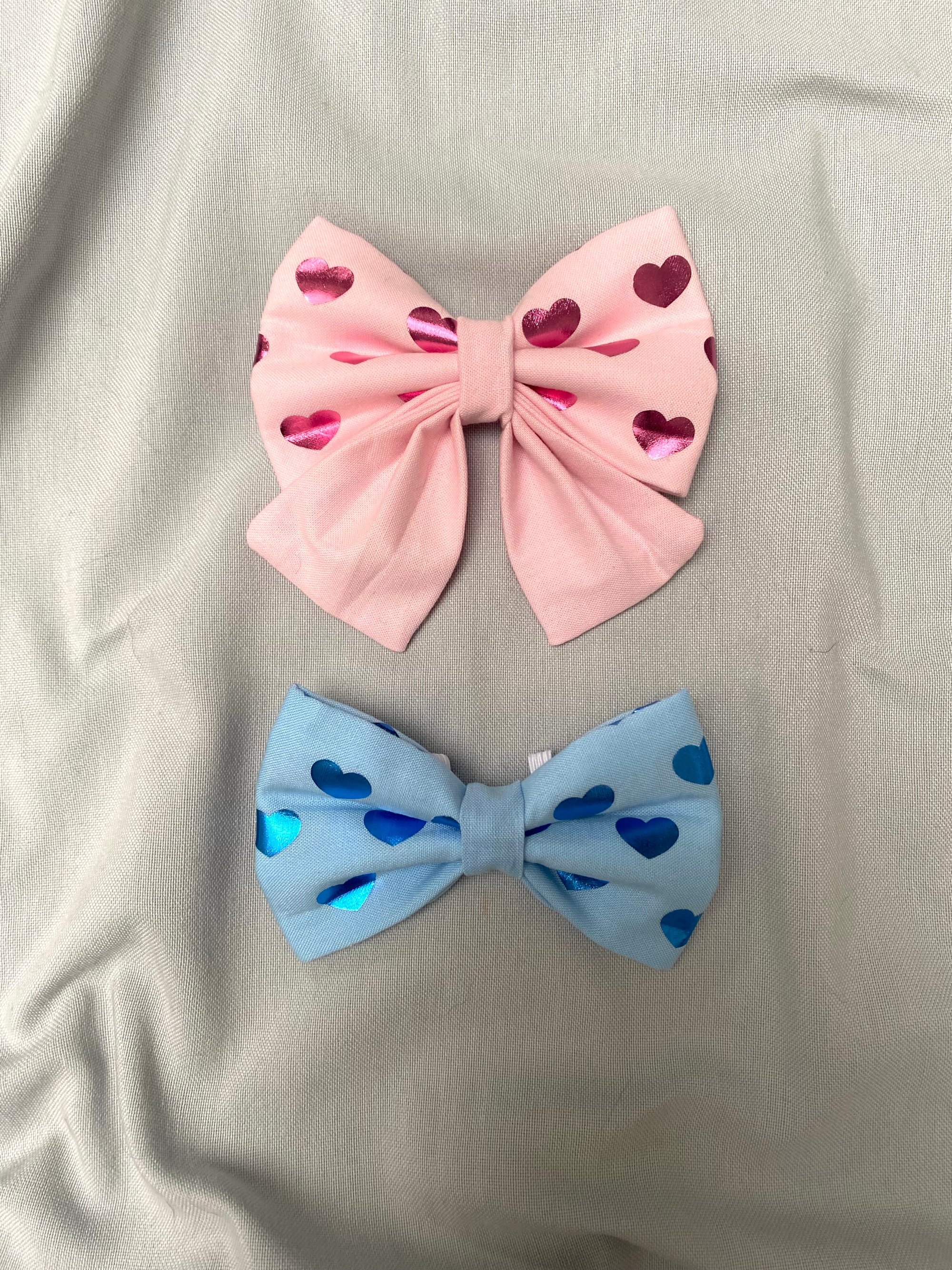 Pink or blue sailor bow or bow tie with hand printed metal vinyl heart print.