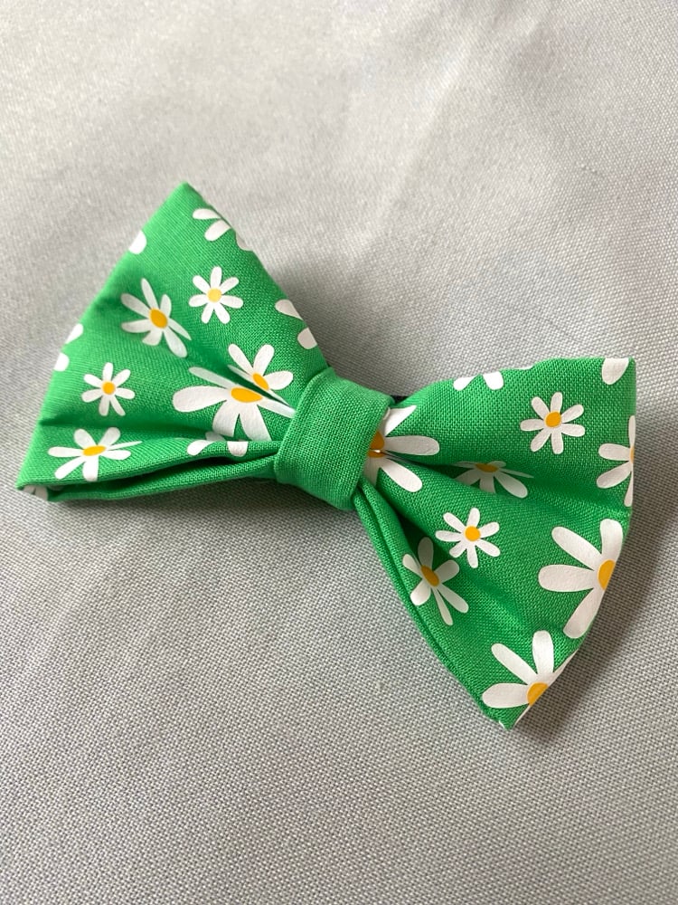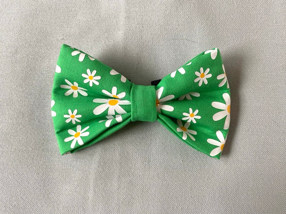 Our bows are handmade with premium printed cotton fabric and are backed with interfacing to help bows keep their shape longer. Bows include an elastic band on the back to slip easily onto collars. Elastic bands can stretch and fit on most collars up to 1.5" wide. Please message me if you need a bow that fits a collar wider than 1.5".