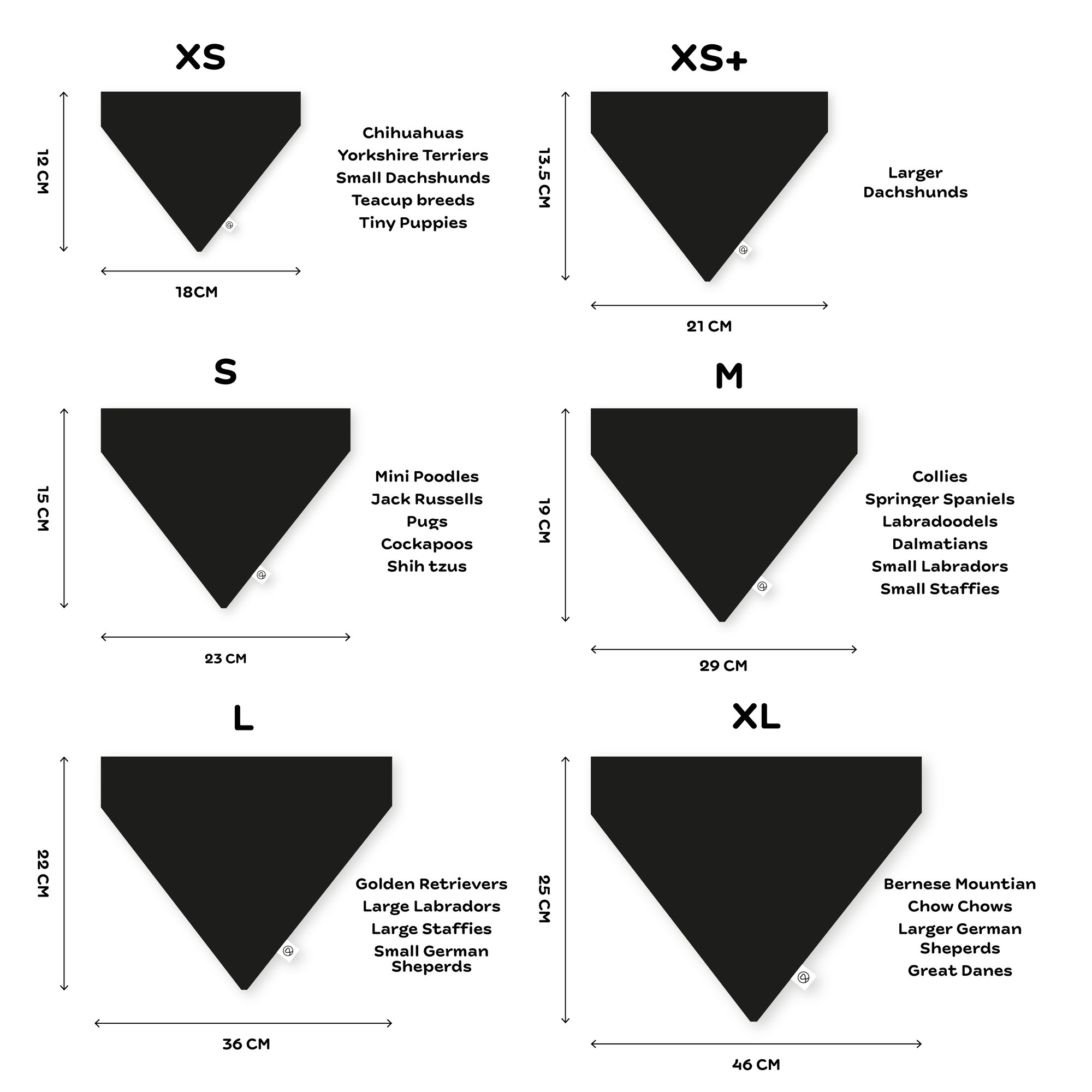 See the size guide in our listing pictures for measurements. Please note that these are the sizes of the ‘slip on collar’ bandanas. The ‘tie on’ bandanas have additional ties attached which you tie around your dog’s neck. The size of the actual bandana is the same.
