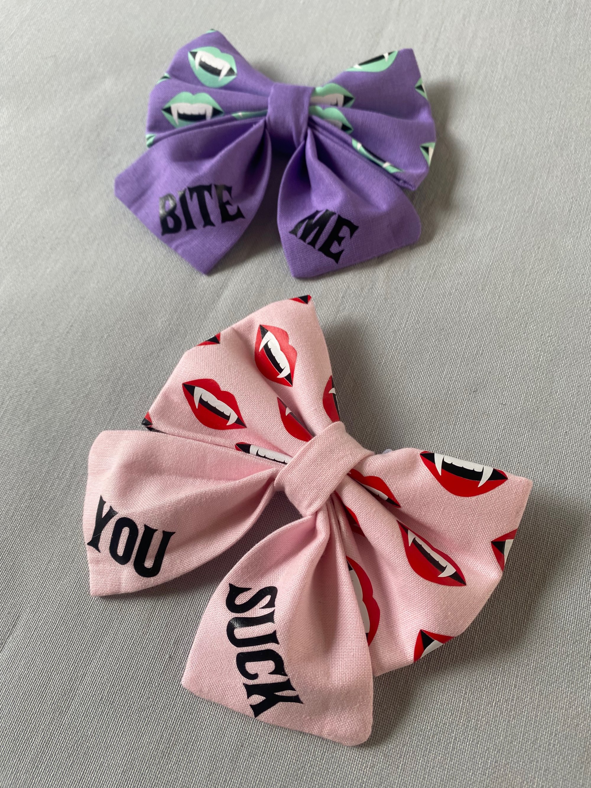 Handmade and hand printed, our Vampire Lips bow ties and sailor bows (with tails) are designed by us, you won't find these anywhere else.