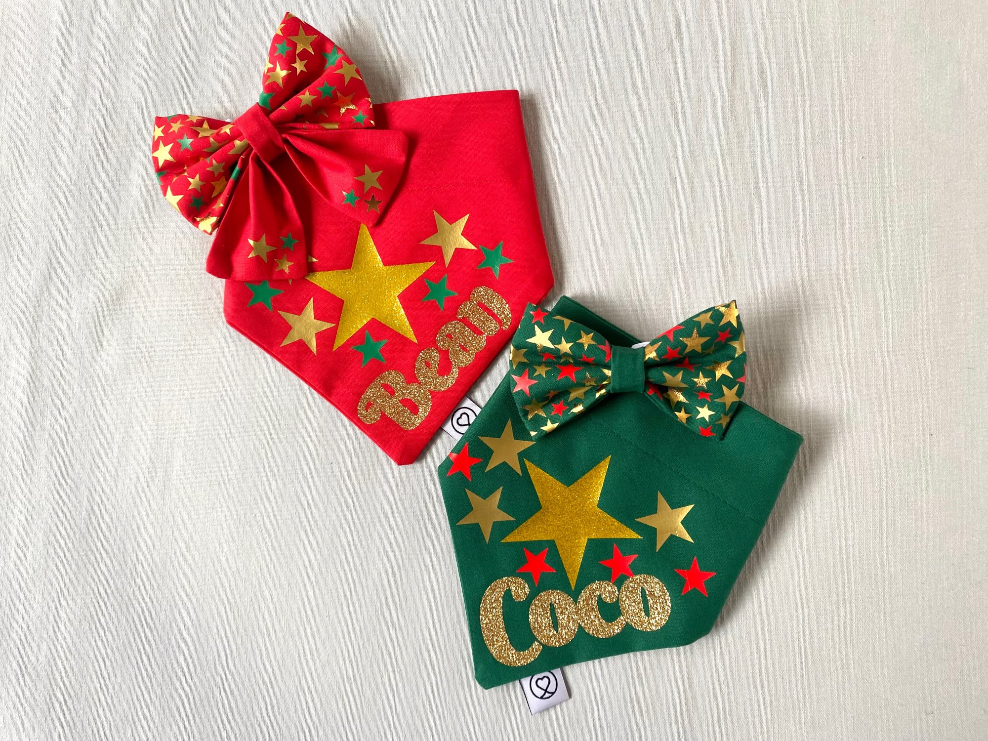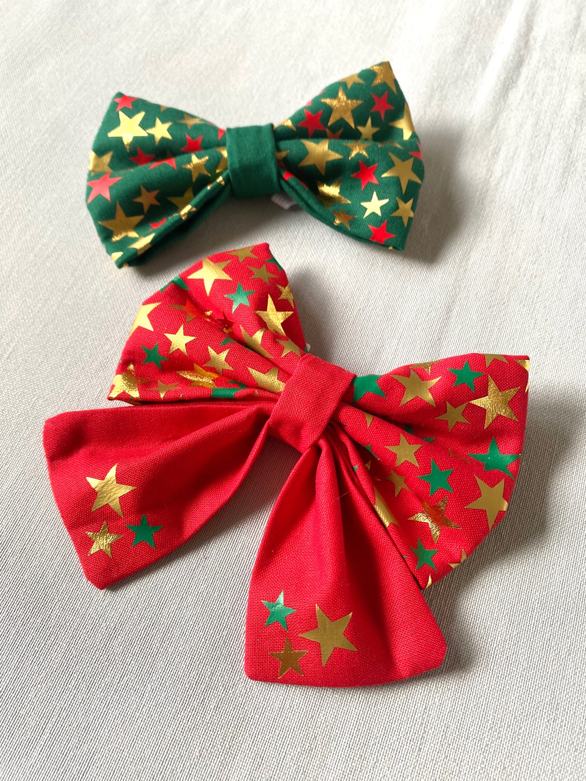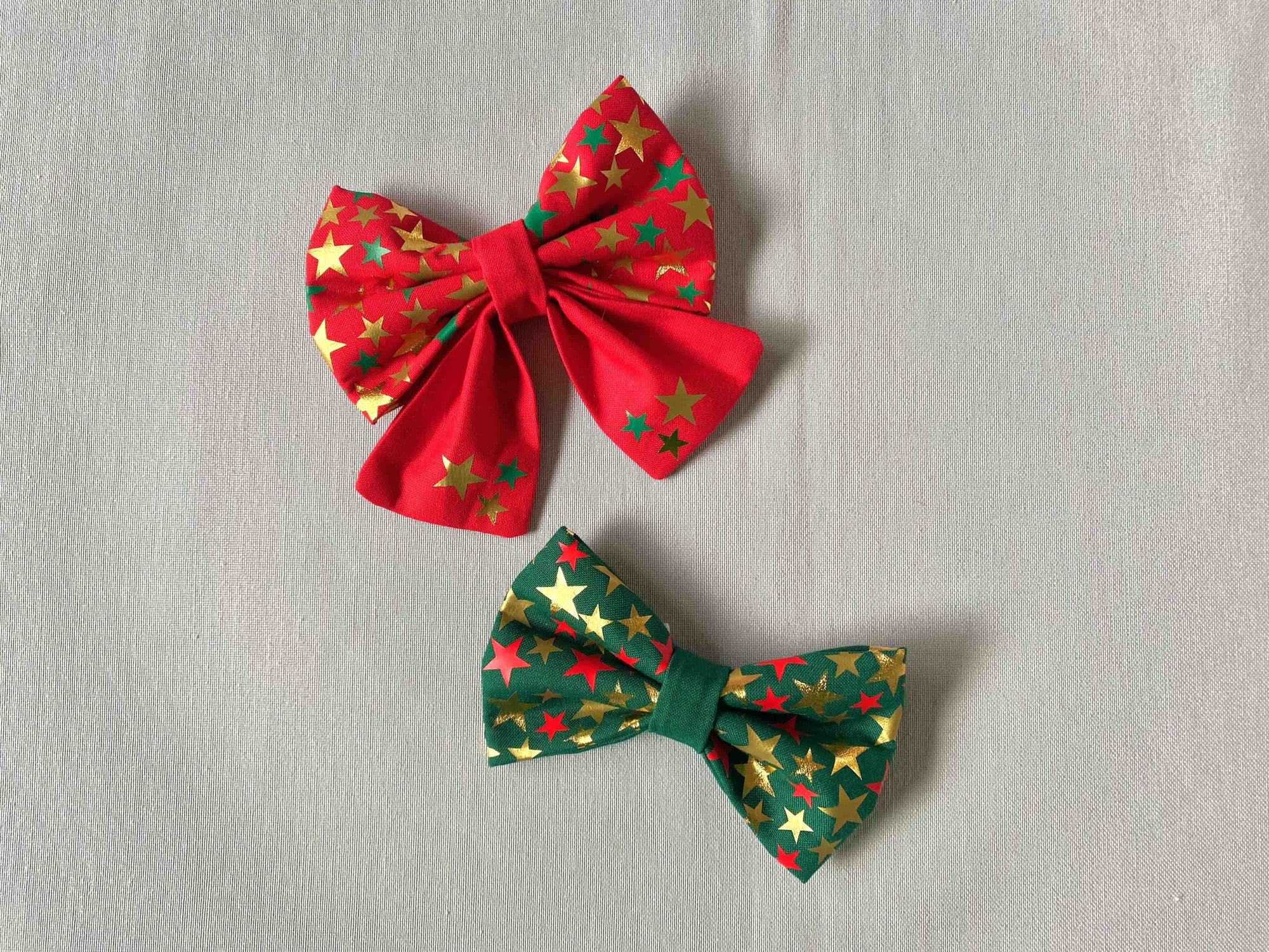Handmade and hand printed Xmas stars bow ties and sailor bows (with tails). Designed by us, you won't find these anywhere else.