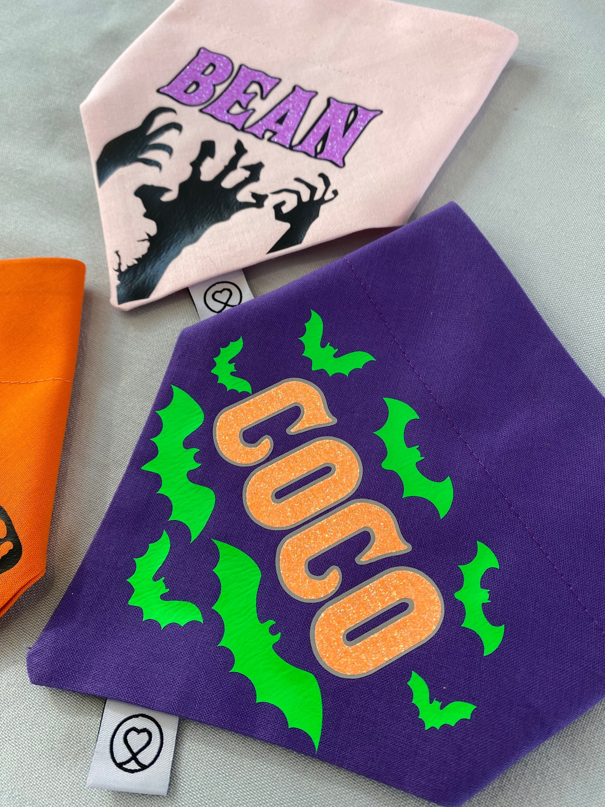 Handmade 100% cotton Halloween personalised dog bandana with hand printed vinyl print. Choose between bats, pumpkins or zombies on a choice of purple, orange or light pink.